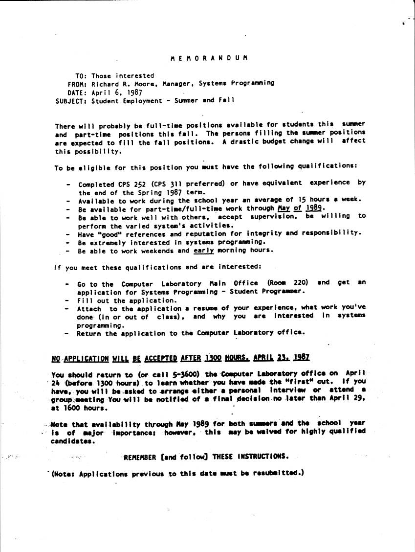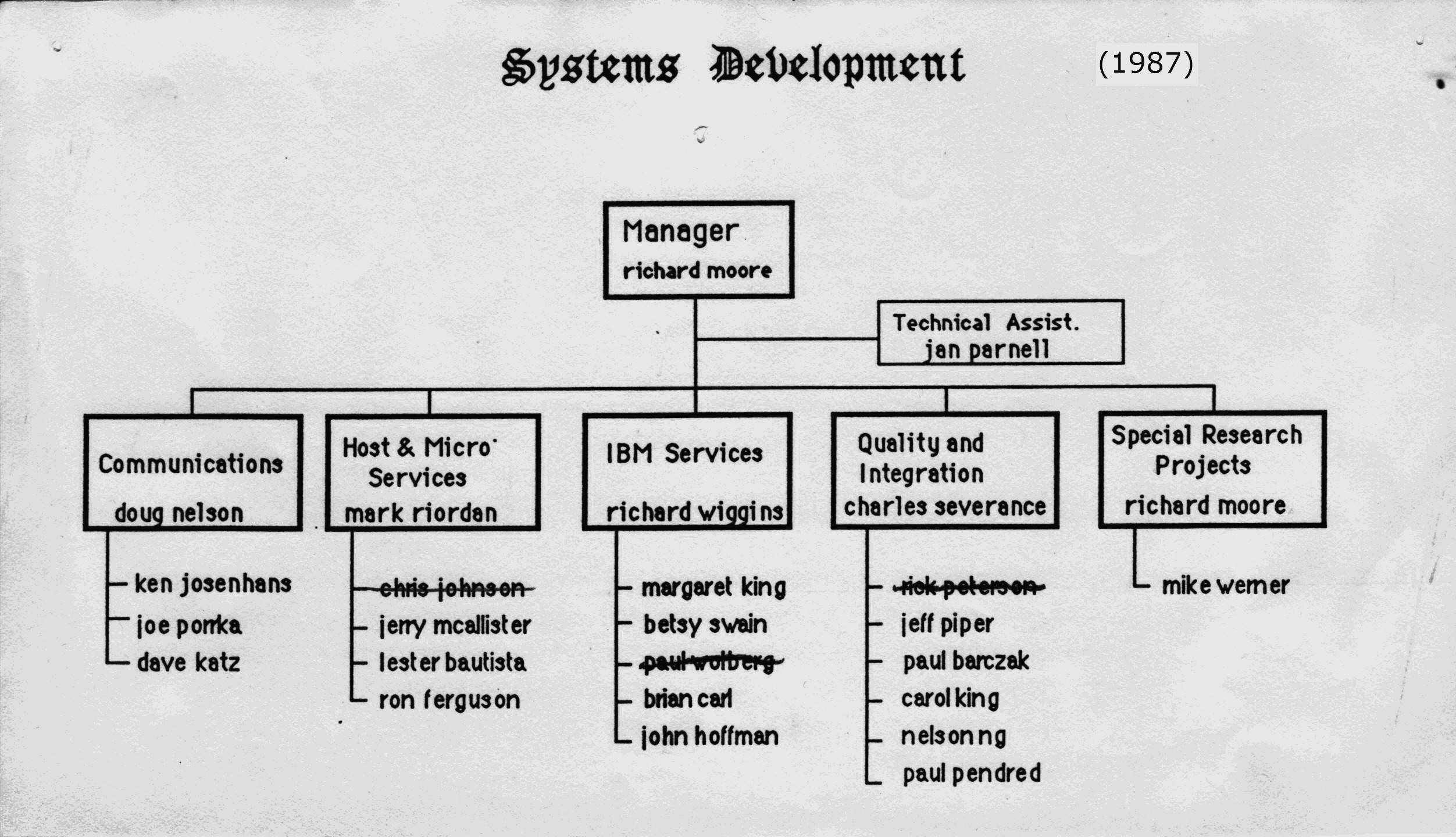 SysDev87.jpg is the organization chart for Systems as of 1987. JobPosting87.jpg is the annual job posting for Systems students, for the Systems class for 1987.